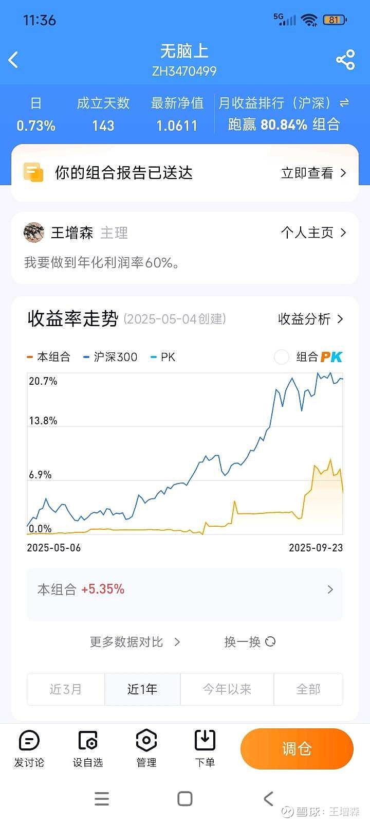$无脑上(ZH3470499)$ 常有老板说牛市。牛市里不一定都赚钱。这个月才改名认真打理的组合,6%的收益率,就能超过80%的组合,说明,牛市里赚钱并不容易。——减去上月结余2.8%,本月盈利3.3%。不是6%。3.3%的收益率超过80%组合。