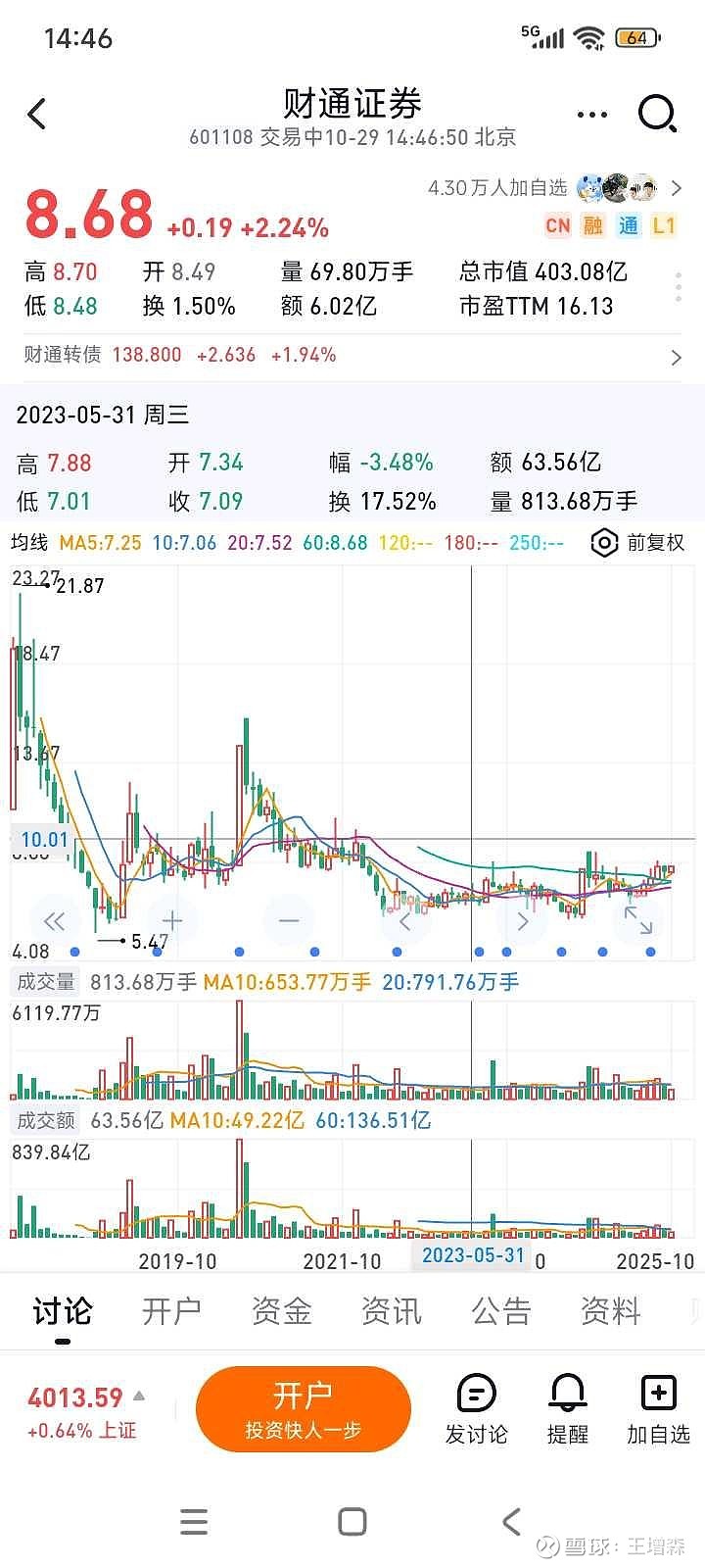 $财通证券(SH601108)$ 老哥,财通证券601108还有救吗。2021年建仓的500万还没回本,一直没动。10块左右的成本。————拿着吧。“长期盘底升底的股票都有发飙的机会”明年到30也可能。