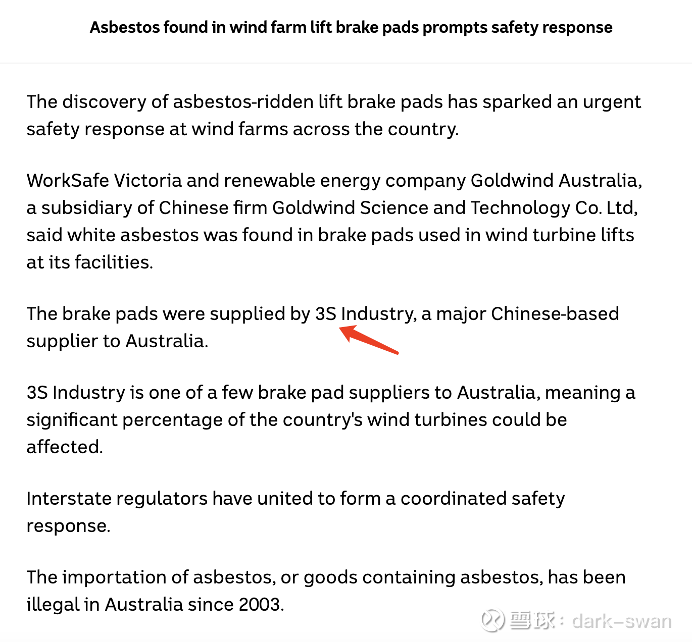 涉及供应商: 这些升降机刹车片由一家名为 3S Industry (中际联合)的中国主要供应商提供。由于该供应商是澳大利亚风电行业的主要零部件来源之一,监管机构担心这一问题可能影响全国范围内的许多涡轮机。