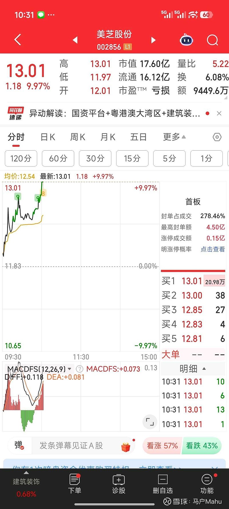 涨停了,这个月运气有点厉害,两次涨停一次天地一次美芝,果断减半仓