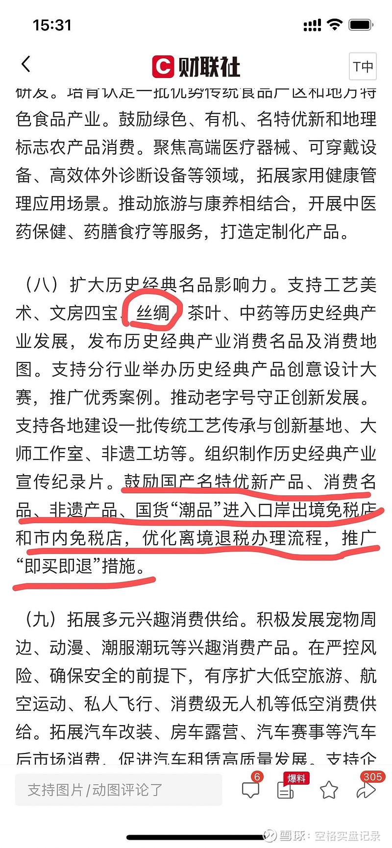 另外,促消费方案中支持丝绸等历史经典产业发展,鼓励其进入免税店,推广“即买即退”措施。