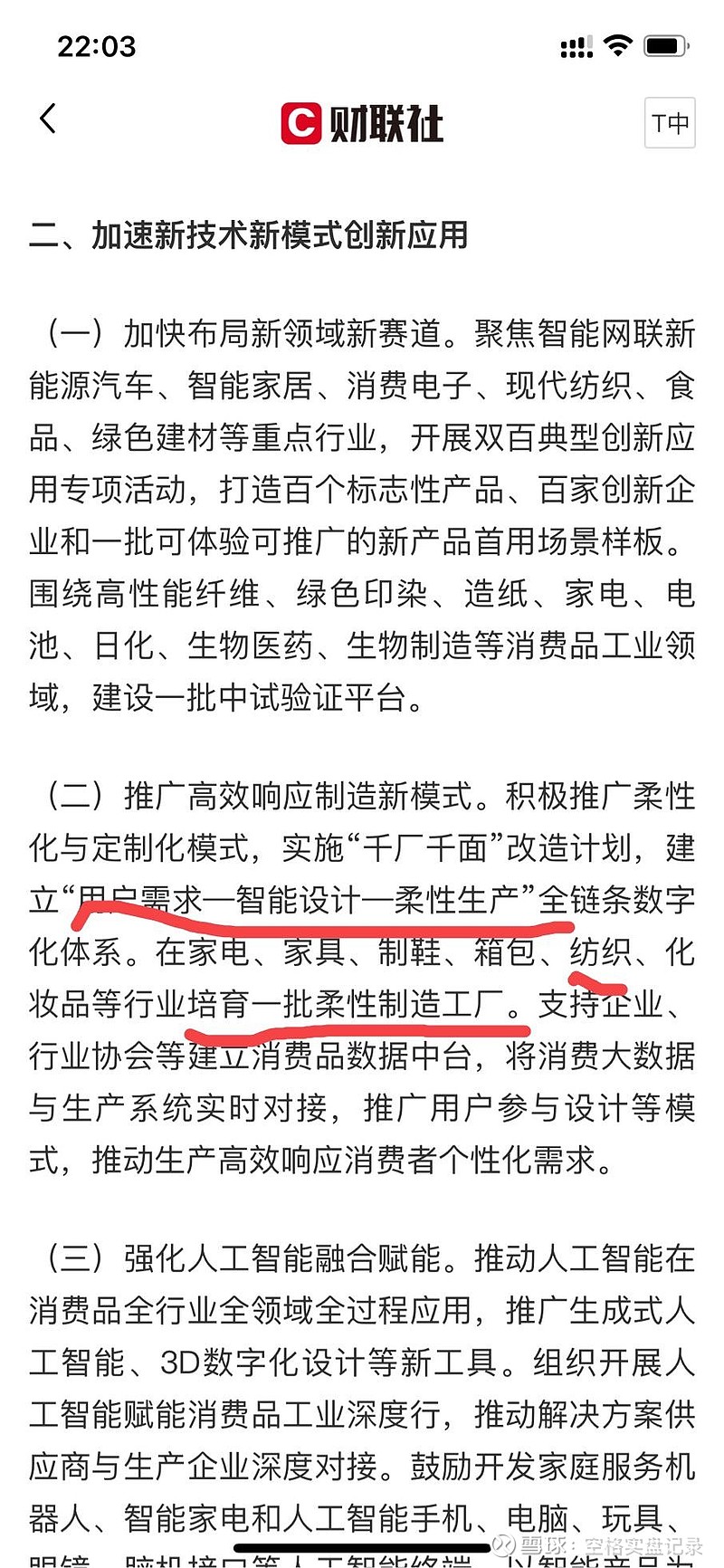 比较超预期的是,方案提出:积极推广柔性化与定制化模式,实施“千厂千面”改造计划,建立“用户需求—智能设计—柔性生产”全链条数字化体系。在家电、家具、制鞋、箱包、纺织、化妆品等行业培育一批柔性制造工厂。