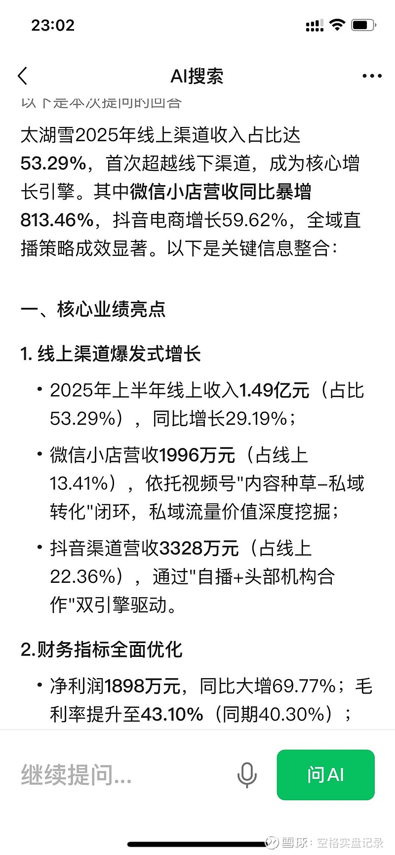 在新型平台消费领域,太湖雪2025年线上渠道收入占比达53.29%,首次超越线下渠道,成为核心增长引擎。其中微信小店营收同比暴增813.46%,抖音电商增长59.62%,全域直播策略成效显著!