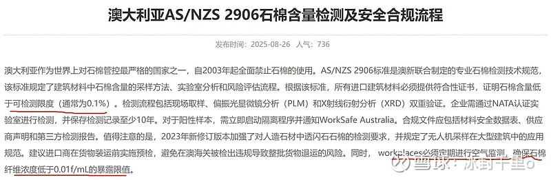 2、澳洲当地政府初步检查结果是没有问题,即低于这个限值0.01f/ml,但当地政府出于谨慎考量,会多做几次检测,后续检测结果未出(我个人理解大概率没有问题),因为公司没有主动添加且刹车片是在密封的工作环境中,里面空气并不会与外部空气循环,与风塔内部是两个环境内。