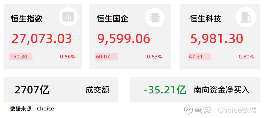 11月13日,港股三大指数集体上涨,恒生科技指数最高涨至1.5%,最终收涨0.8%,恒生指数、国企指数分别上涨0.56%及0.63%,恒指更是站上27000点上方。