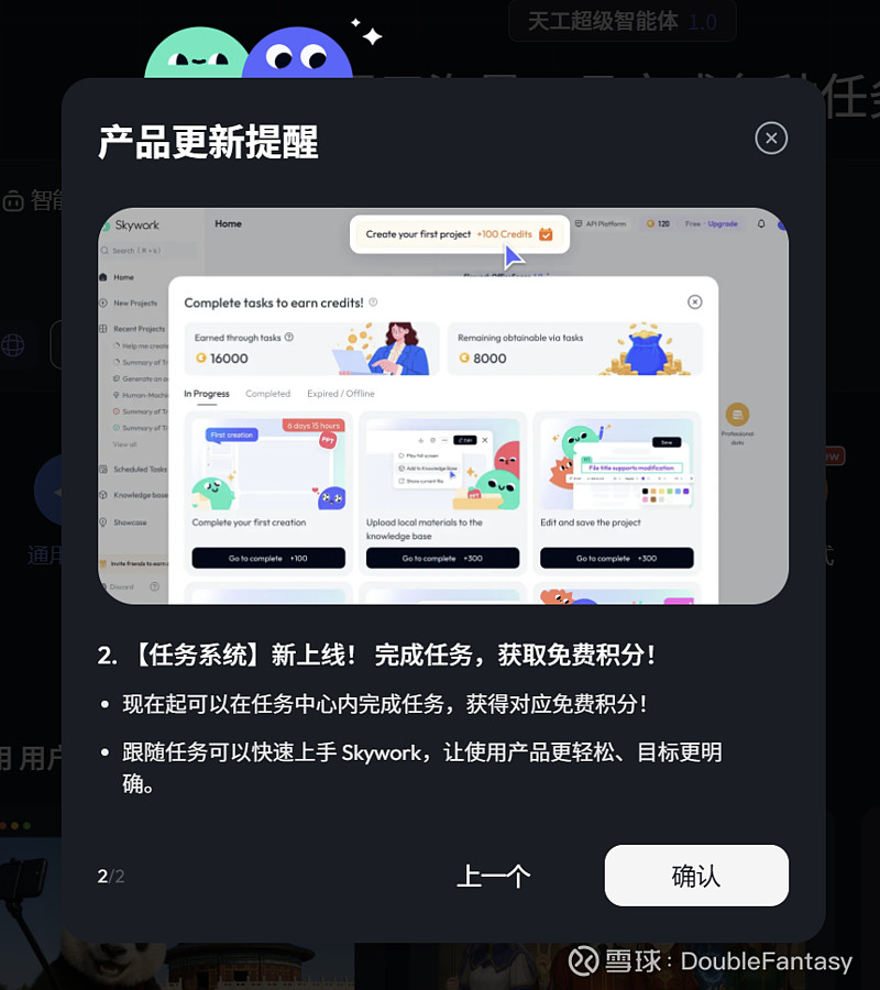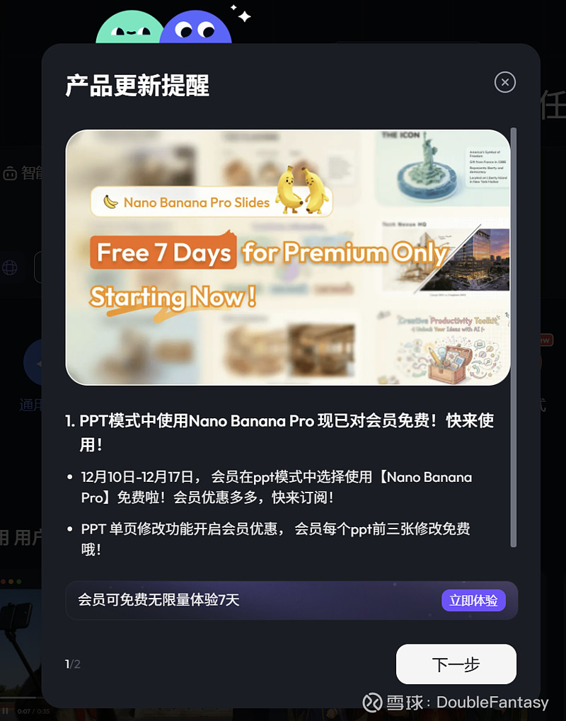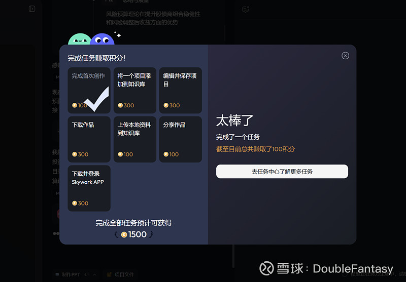 公司似乎开始调整宣传策略了。skywork开启了由nano banana pro赋能的PPT会员免费周,还推出了完成任务送积分的机制,鼓励多多使用和分享。