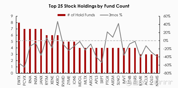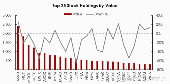 按mkt cap value匡,有个别没在top25,但其实很多粉丝的,比如xene, 做cns, akro, mash/nash很值得关注的一个公司;比较意外的是lly, 在top33, 不过就orbimed有,算是top50里市值最大的标的 (废话,本来人家就是pharma top1)
