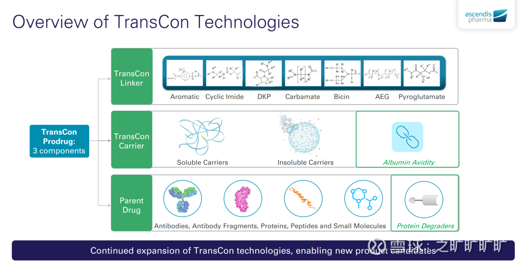 Ascendis比较有名的是TransCon (Transient Conjugation,暂时连接) 技术,该技术包含三个组成部分:未经修饰的patent drug、保护原型药物的惰性carrier (PEG或其他多聚物) 和暂时连接两者的linker (是技术关键,裂解取决于PH跟温度->裂解了分子量也就没那么大了),该技术可使得原型药物以可控方式释放,不被人体迅速清除,延长药物作用时间