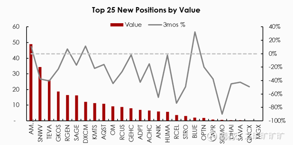 如果看新建仓标的,by value top1是amgn (不知道为啥图里就显示了个"AM",略迷惑), 分别是deep track跟orbimed买的 (赌减肥药么?),其他还有,snwv, teva, gkos (眼科), rgen (不是regn), sage, dxcm, kmts, aqst, om, rcus...好多完全不熟,得努力再学学