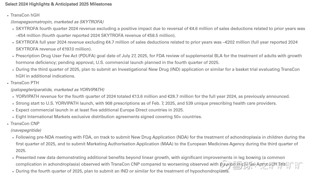 Ascendis pipeline多内分泌产品,几个核心产品:隆培促生长素 (lonapegsomatropin, TransCon hGH, Skytrofa)、那韦培肽 (navepegritide, TransCon CNP)、帕罗培特立帕肽 (palopegteriparatide, TransCon PTH),这也是目前维昇的所有产品...维昇我当初想当然了,以为就个“长效生长激素”,回头得再研究下