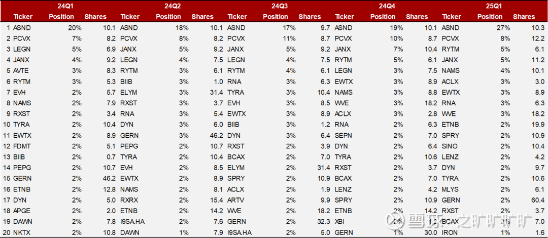 后面几个基本都是大家老熟人了,incy (但就baker bro有), mdgl, ewtx (粉丝最多...), argx, rvmd, pcvx, rna, janx (粉丝很多), smmt (就baker bro有), aclx, bpmc, srpt (四家还在,没想到那么多policy headwind+elevidys挂了个患者,大家还在), wgs (去年股王,把辣鸡业务剥离后轻装上路;不过25q1就casdin capital)