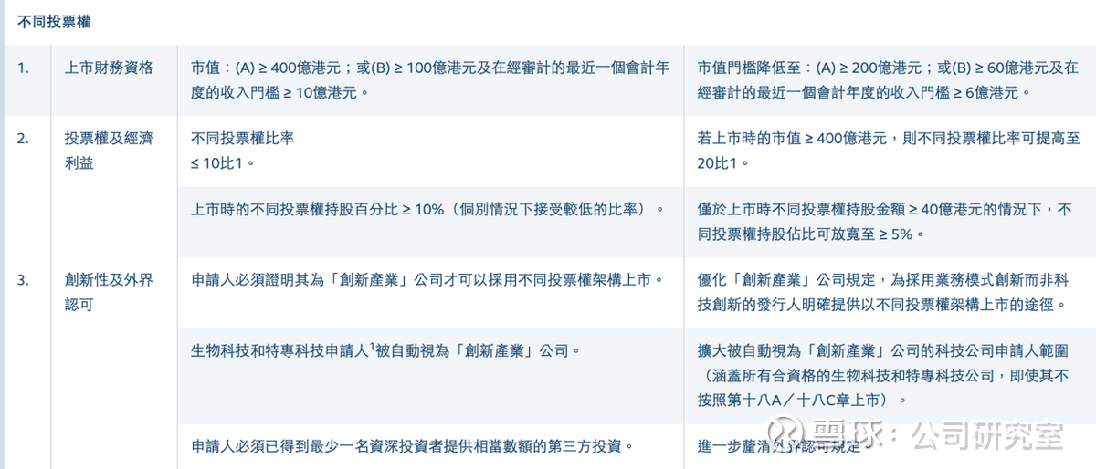 与此同时,如果公司上市时市值达到400亿港元,WVR投票权比例上限可从10比1放宽到20比1;在特定条件下,WVR持股的最低经济利益要求也可由10%放宽到5%,前提是持股金额至少达到40亿港元。