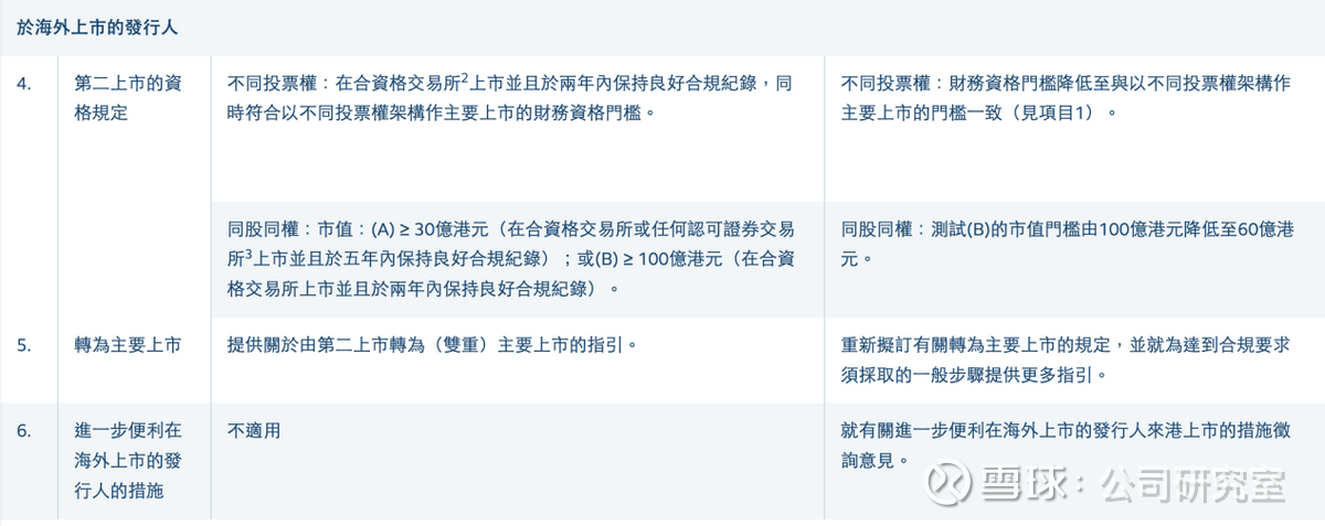 在核心资格要求上,不同投票权架构公司的财务资格门槛直接与主要上市对齐,不再额外设限;而同股同权公司的第二上市市值门槛更是大幅下调——原要求的100亿港元门槛直接降至60亿港元,让更多中大型海外上市企业具备了来港上市的条件。