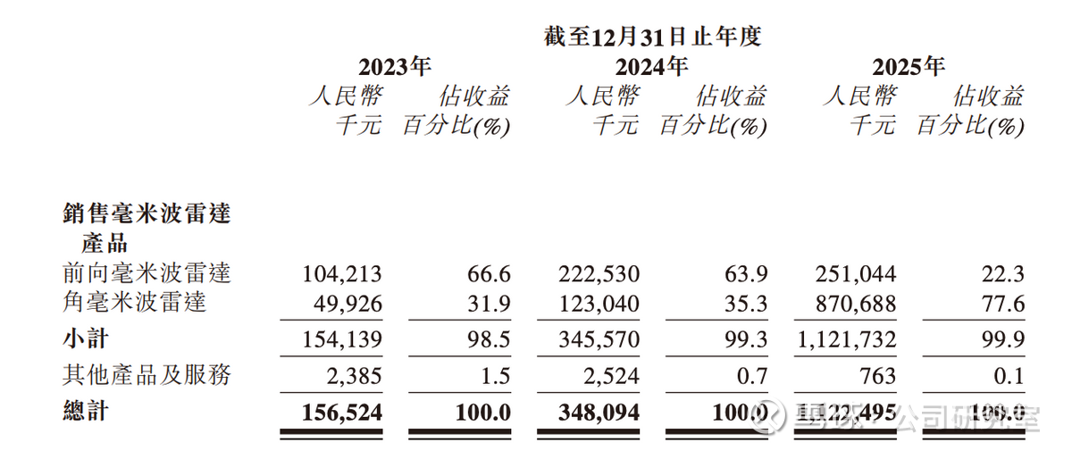 从收入结构看,公司业务高度聚焦毫米波雷达产品,其收入占比从2023年的98.5%持续提升至2025年的99.9%。