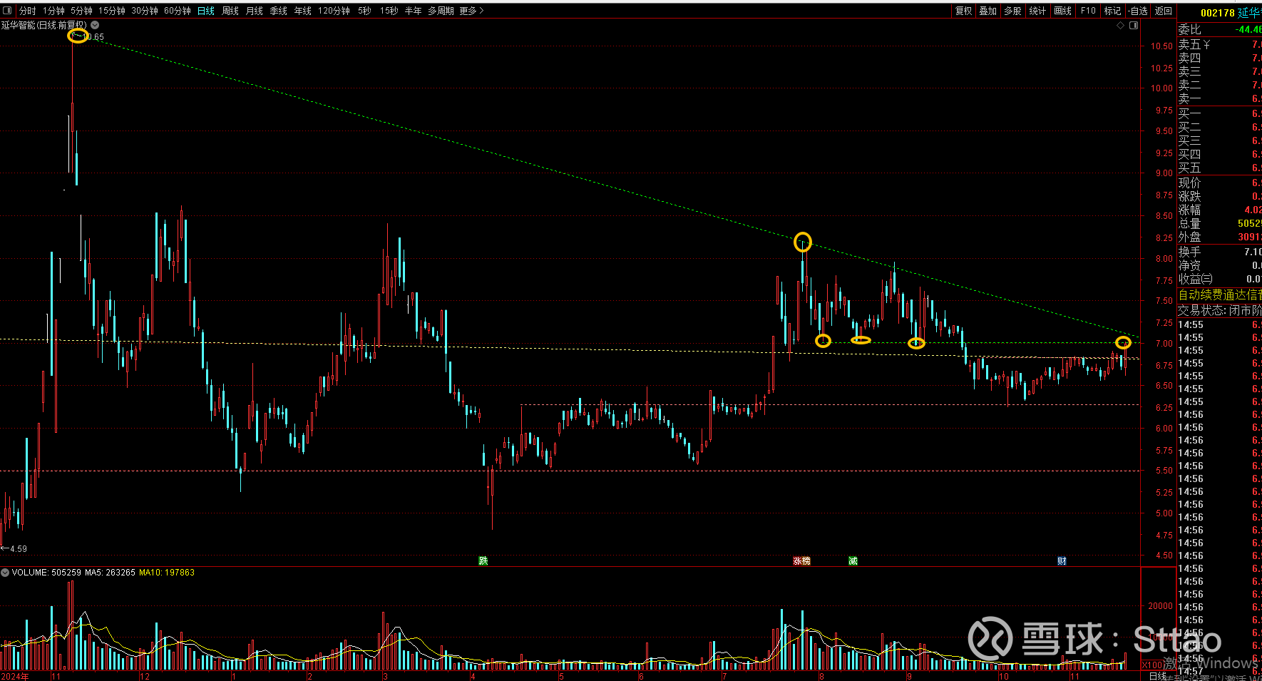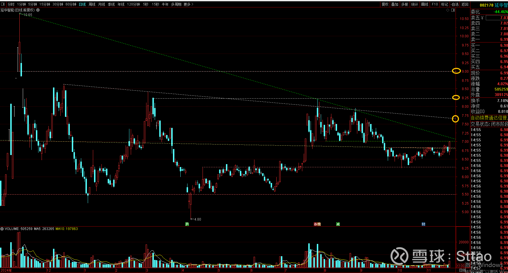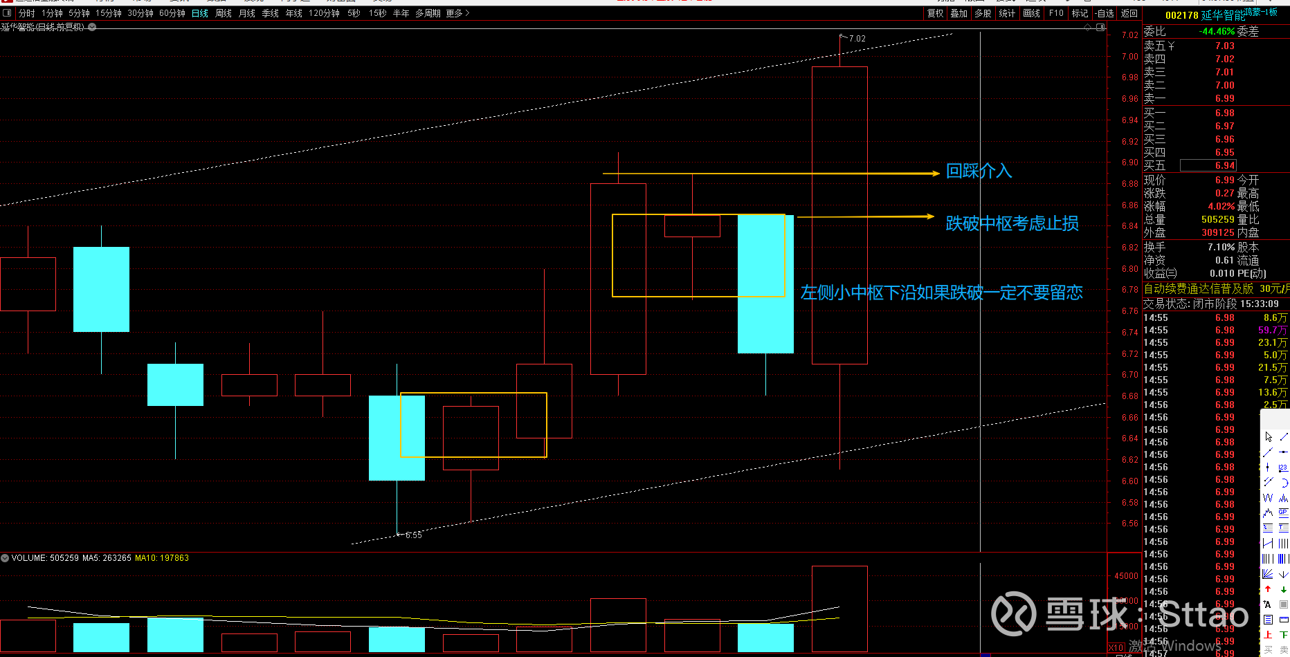 其实当下是一个博弈点,但确定性并不强,可以试错,最坏情况就是和6月5日假突破一样后面再回调一次才真正走一波行情。这里止损设置在6.85元。这里面60日均线和5日线是近期的重点对象。