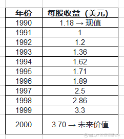 我们来看一些例子,然后再进行深入分析。下面是报业巨头甘尼特公司历年的每股收益情况: 甘尼特公司1990~2000年收益情况