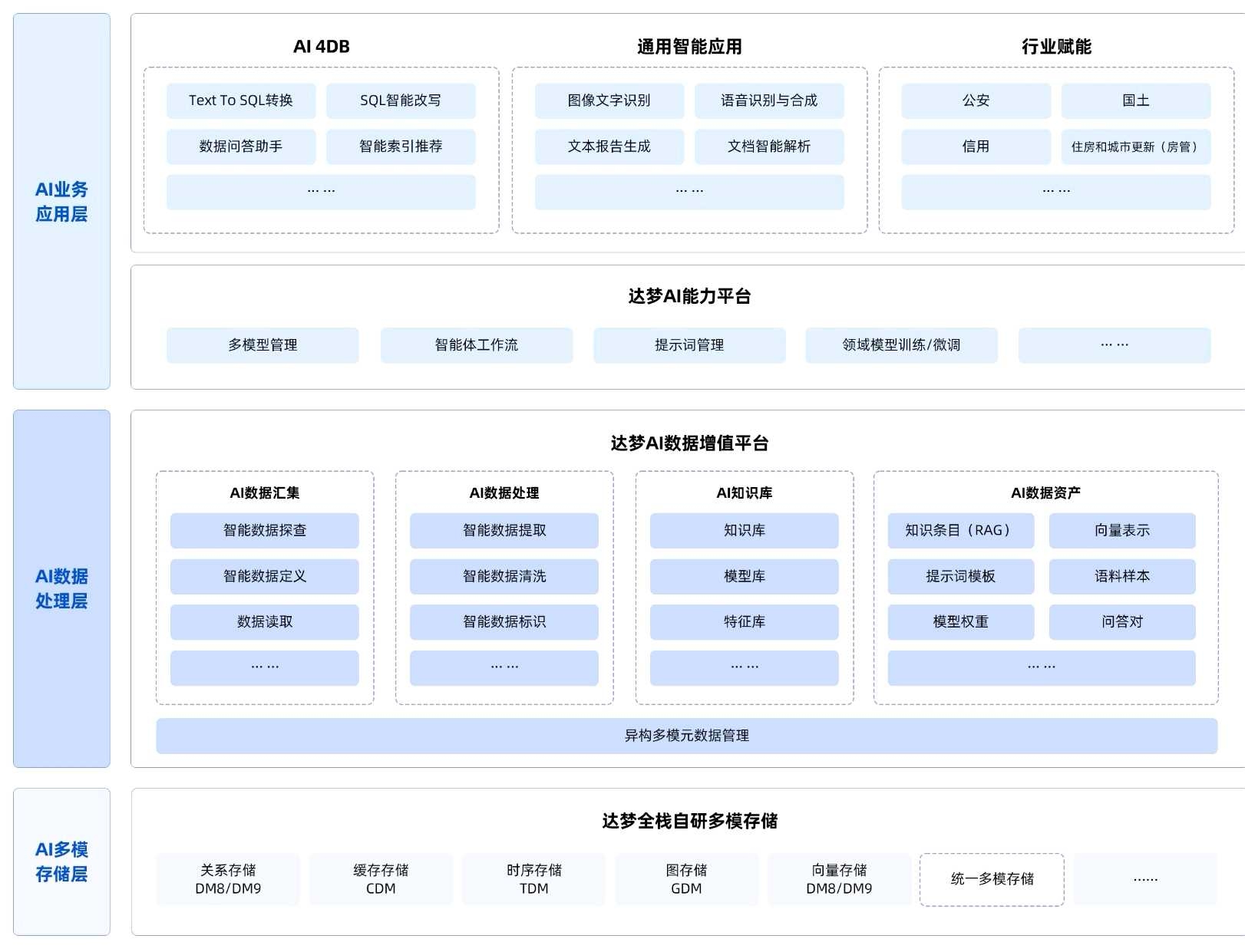 五、达梦数据还提供AI智能数据底座“达梦启智多模智算平台”,专注于解决客户在AI落地过程中的关键痛点,如AI数据资产复用、多模型自由选择、核心资产安全保障等,架构如下图。