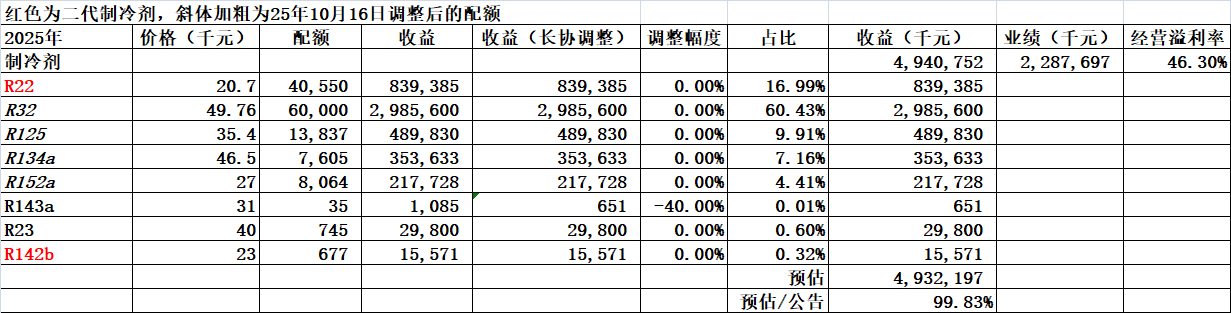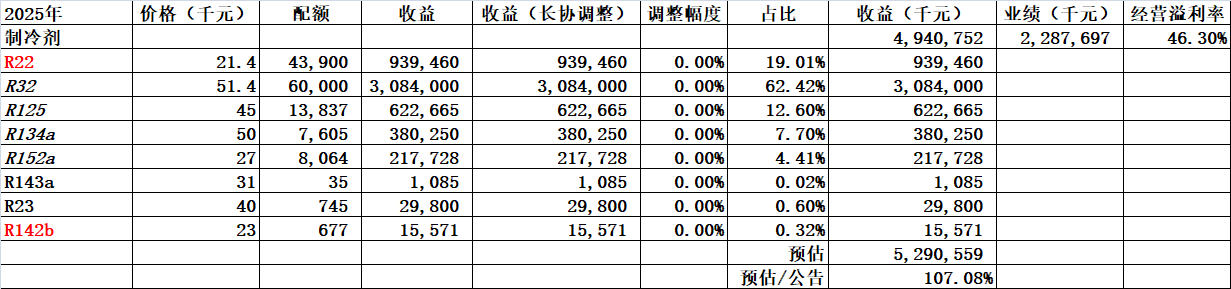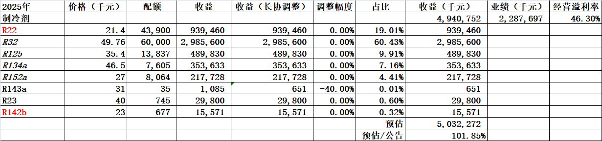 众所周知2025年东岳R22的配额是43,917吨,内用配额22,442吨,出口21,475吨。