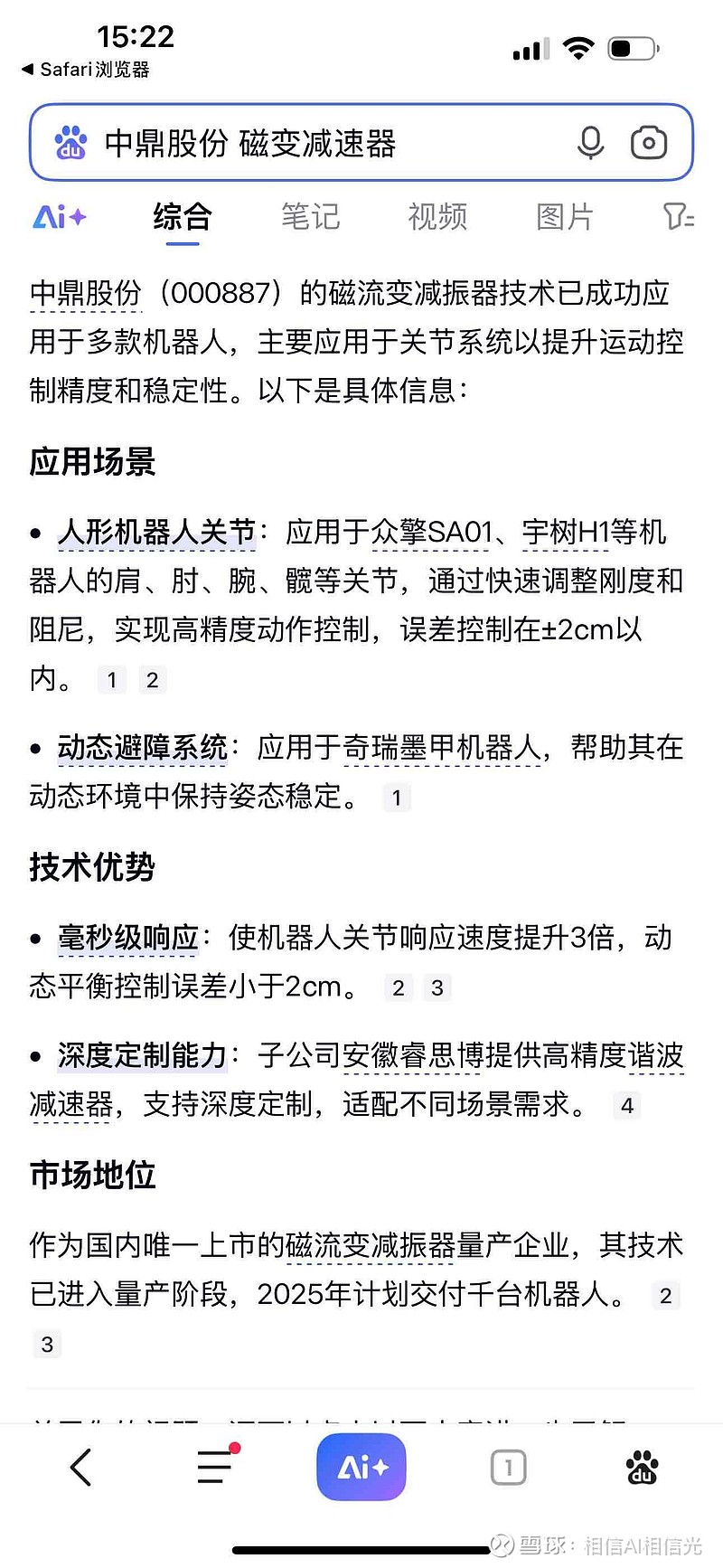中鼎股份(000887)的磁流变减速器技术已成功应用于多款机器人,主要应用于关节系统以提升运动控制精度和稳定性。作为国内唯一上市的磁流变减速量产企业,其技术已进入量产阶段,2025年计划交付千台机器人