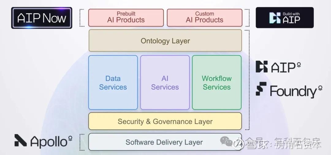Palantir的产品堆栈展现了相互促进的关系。从部署软件的Apollo到安全和治理层,再到本体层的Foundry和Gotham,最上方则是AIP智能层。