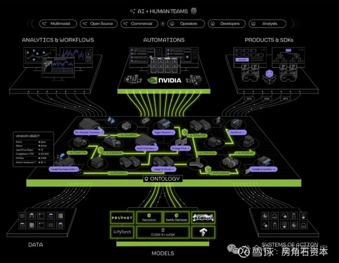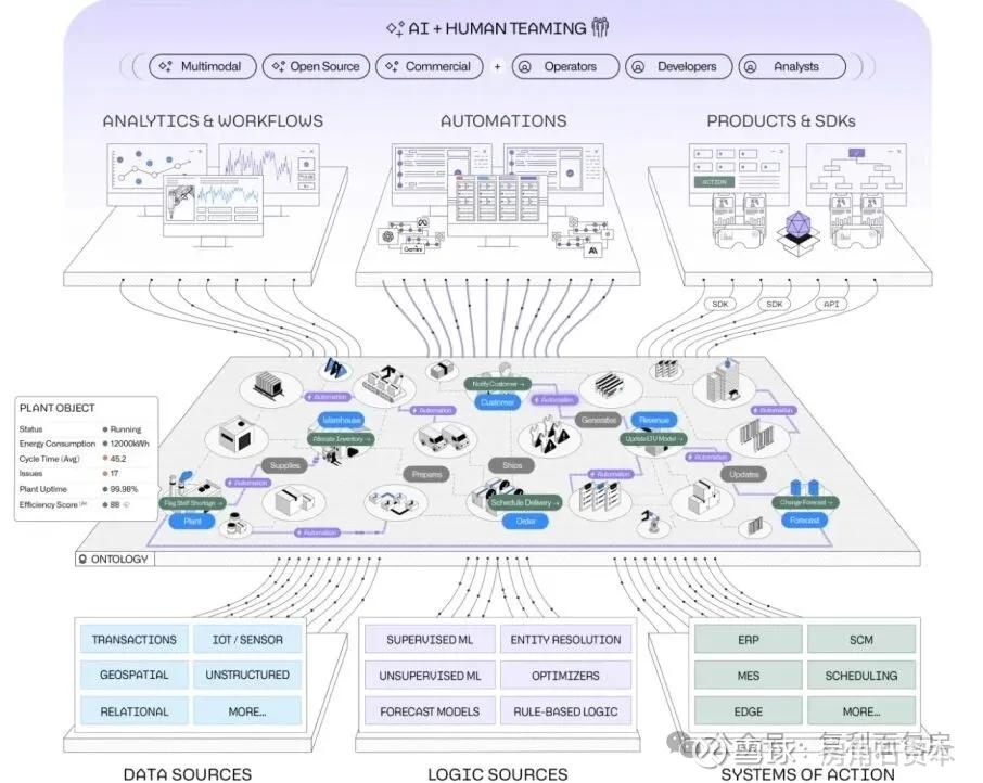 这听上去并不是很深奥,但是Palantir的独特性在于,不论是对数据编排还是业务应用,都实现了完整闭环的解决方案。不仅是把数据进行分析,创建精美的可视化(传统商业BI)供人类决策,Palantir的系统可以生成见解,优化现有运营卡点,自动化执行任务,同时保留人类安全、监督、审查等基本权利。这是一种深度的、端到端的操作系统,从底层数据输入,直接到业务的最末端,并且可以双向流动,反馈以便改进系统。Palantir通过将企业的所有对象和数据的统一编排,采用被称之为“Ontology 本体论”的构筑方法,把所有的组织内的业务实体以及附着在实体上的数据都转换为相互关联的本体对象,其基本要素为:数据Data,逻辑Logic,行动Action。这套基于“Ontology 本体论”的产品架构也是最重要的护城河之一。