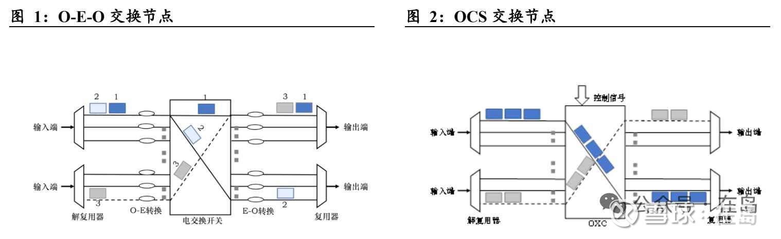 OCS 光交换是一种无需光电/电光(O/E/O)转换,直接实现光信号在光纤端口间切换的技术。相较于传统交换机以光-电-光信号转换的形式进行数据交换,OCS 全光互联交换机直接通过光信号交换来进行数据交换。看下图,很明显,因为少了一道“电”的环节,所以他的传输交换会更快。