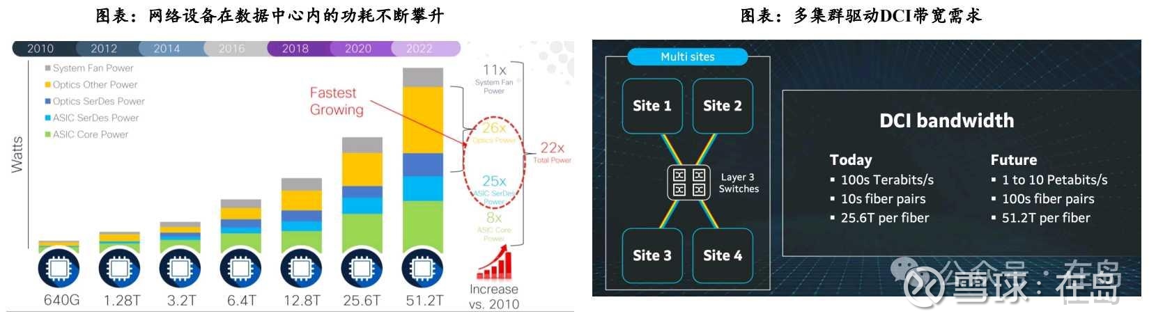 (1)功耗与散热:根据Cisco 的长期测算显示,至 2022 年数据中心交换系统总功耗较 2010 年提升 22×,其中“光学相关组件”功耗提升 26×