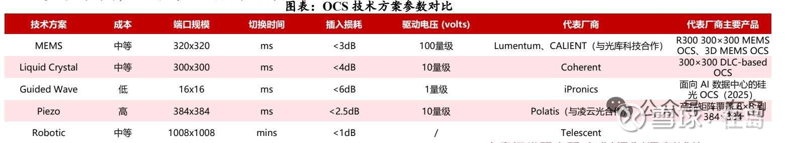 (1)MEMS:优点:端口规模可做到百×百级、插损低、成熟度最高,已在超大规模数据中心承载生产流量。缺点:机械微镜致动,典型切换时间 ms 量级;高端口封装/准直复杂。代表厂商及订单:CALIENT(与光库科技合作)、Lumentum(Lumentum表示其OCS业务在2025财年第四季度首次实现收入)、Drut、华为等。谷歌在 Jupiter/Apollo 中批量部署 MEMS-based OCS;Lumentum 推出 R300 300×300 MEMS OCS;CALIENT 长期提供 3D MEMS OCS。