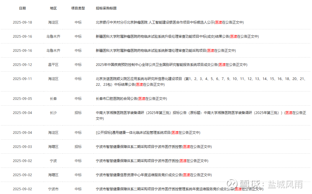 地域分布广:涵盖北京(海淀区、昌平区)、新疆(乌鲁木齐)、吉林(长春)、湖南(长沙)、浙江(宁波)等多个地区,体现出在全国不同区域医疗信息化建设或服务需求的布局。