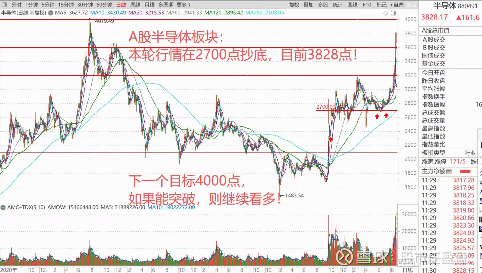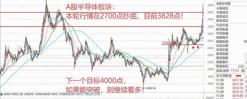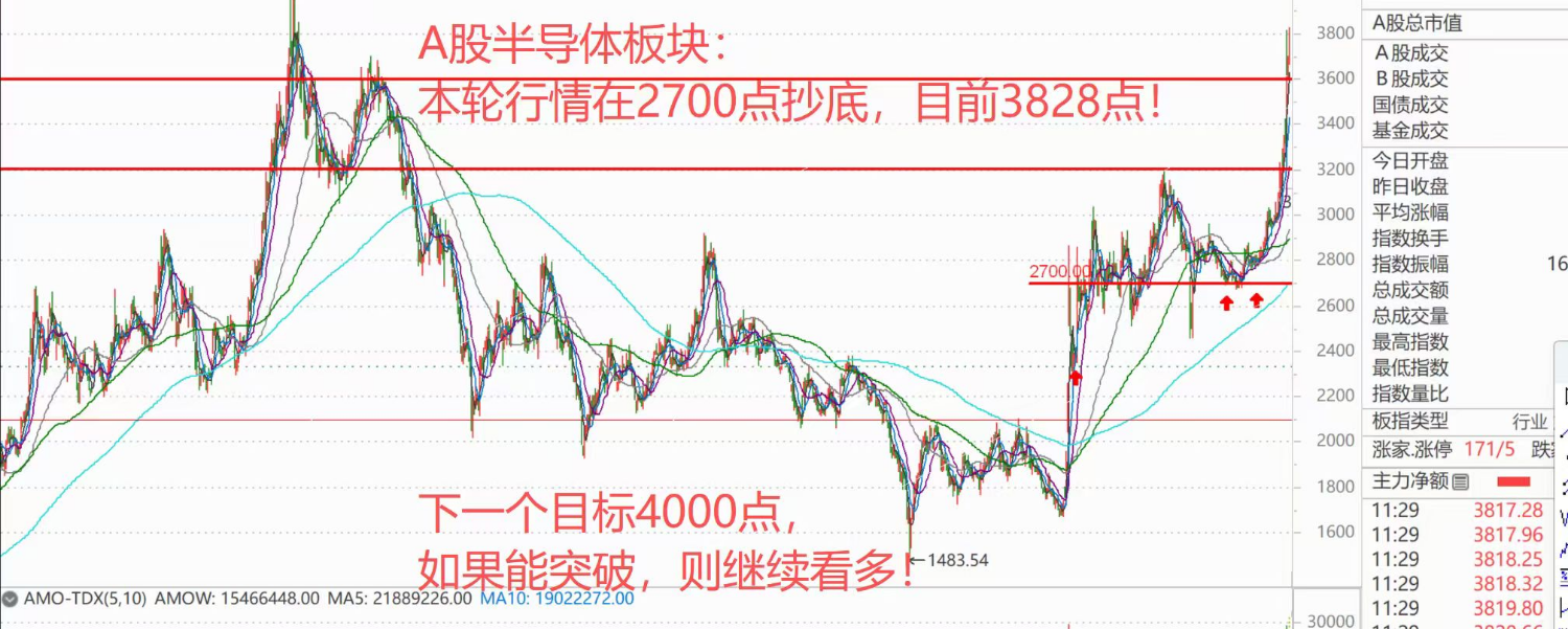 综上所述,所以看上去非常狂热的行情,其实只发生在极度的局部。半导体板块我从6月底回踩到2700点附近看多,到现在也才2个月时间,今天午间收盘都已经涨到了3882点!昨天半导体板块跌幅居前,当时收评告诉大家,回踩不破3600点继续看多,不要怕高!昨天最低回踩到3602点,就直接涨上去了!