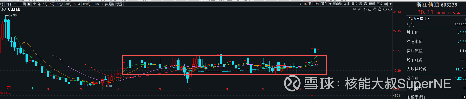 回到浙江仙通的股票上,从浙江仙通的股票价格月线图上,我们可以清楚的看到2020年4月——2025年9月,浙江仙通的股票价格95%的时间都在11.50——17.50中间波动,在整整5年的时间里,浙江仙通的估值体系一直保持稳定,市场也总是在围绕这个价格循环。
