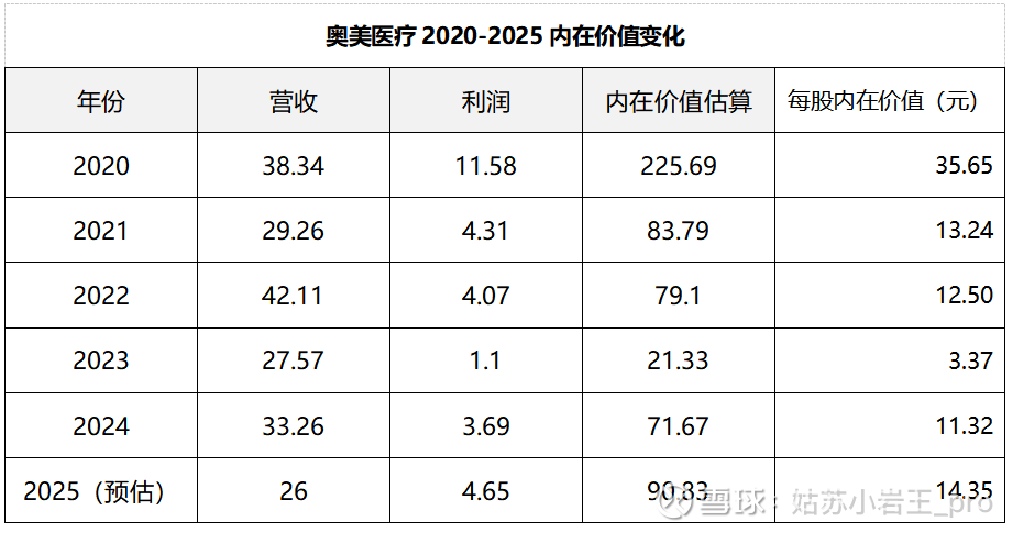 从企业内在价值变化的趋势看,奥美医疗2023年触底反弹,2025年的内在价值已经超过了2021年,再创新高。2020年由于特殊原因,不纳入考量。