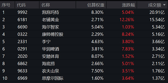 港股通消费ETF汇添富(159268)标的指数热门成分股多数飘红,老铺黄金涨超12%,康师傅控股涨超8%,华润啤酒涨超7%,泡泡玛特涨超5%。(成分股仅做展示,不作为个股推介)
