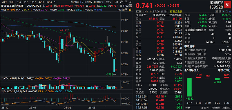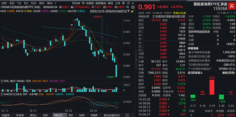 今日(3.24),港股消费午后大举反攻!聚焦纯正新消费的$港股通消费ETF汇添富(SZ159268)$ 大涨4.77%,盘中成交额已超8000万元,大举放量!资金面上,近5日有3日获净流入,近10日累计“吸金”超4000万元!