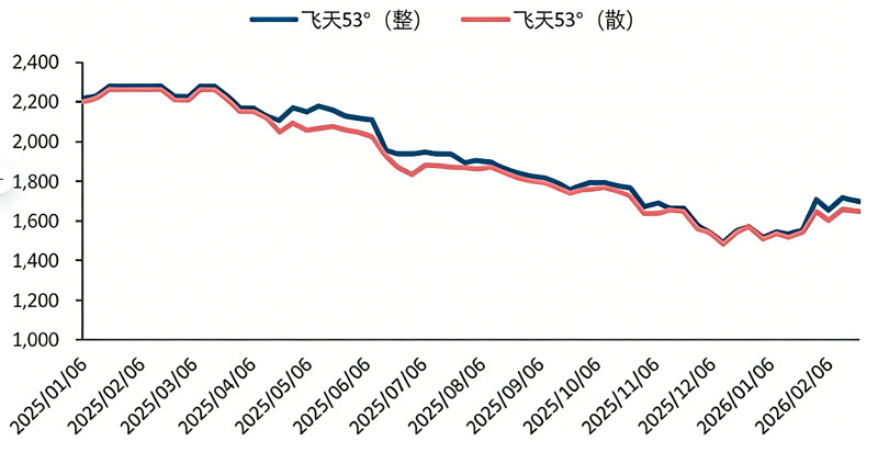 茅台批价触底:2025年茅台批价大幅下降,2026年春节前企稳回升,节后批价稳定在1600元上下。2025年飞天、普五批价大幅下降,根据今日酒价、酒价参考,12月飞天散瓶最低价格一度跌破1500元,普五批价也跌回820元左右,二线品牌原千元价位产品基本降价至700元价位。26年初茅台依托i茅台平台落地“全面向C”战略,从而实现春节期间动销、出货、批价、新客户开拓等全面超预期,批价重回1700元以上,节后普飞控量、并进一步落地非标代售政策,节后批价稳定在1600元上下,茅台批价底部基本确认。