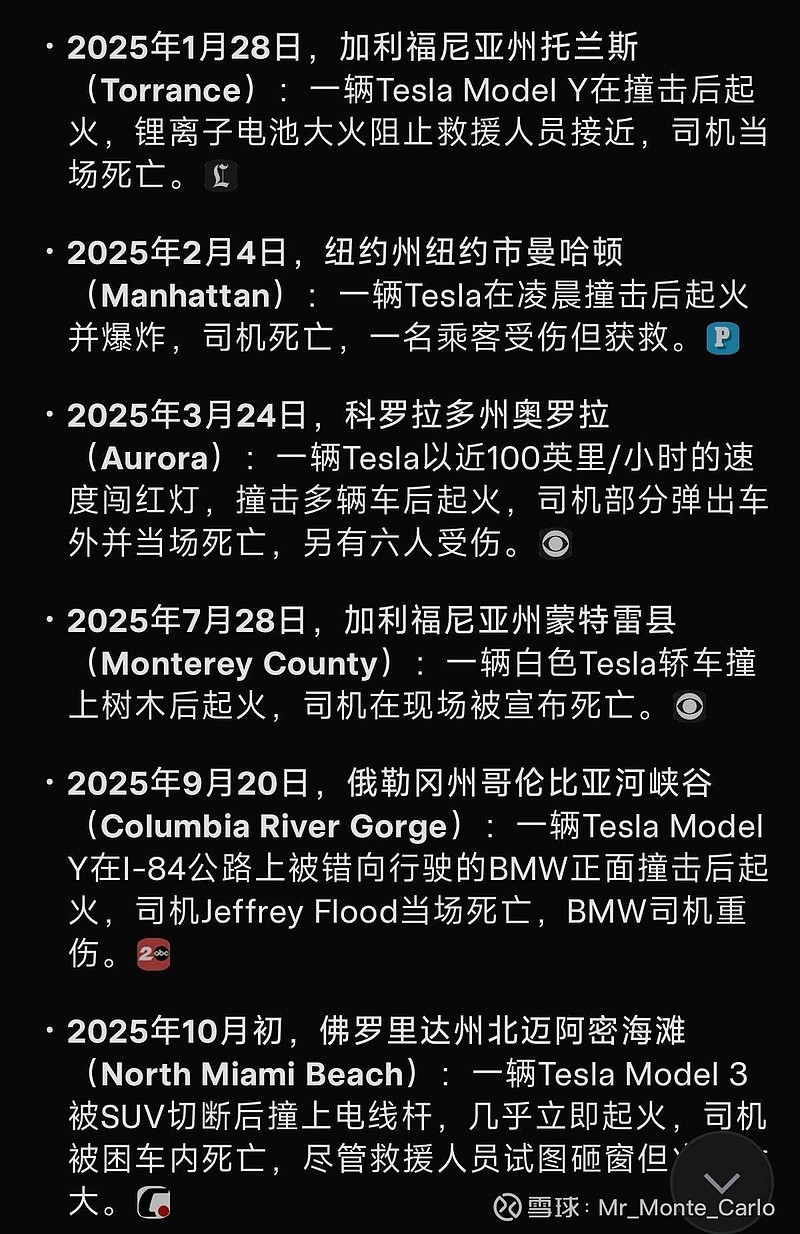 $小米集团-W(01810)$ 随手搜了一下特斯拉在美国的交通事故着火导致驾驶员丧生的案件,发现非常的多,2025年就好几起,如果放在中国的舆论环境小米身上,这个简直是不可以想象的。电动车超速撞车导致起火爆燃,驾驶人员丧生,车门打不开,这种事儿在任何的车企身上都有可能发生,所以今天你落井下石,明天就会被反噬。