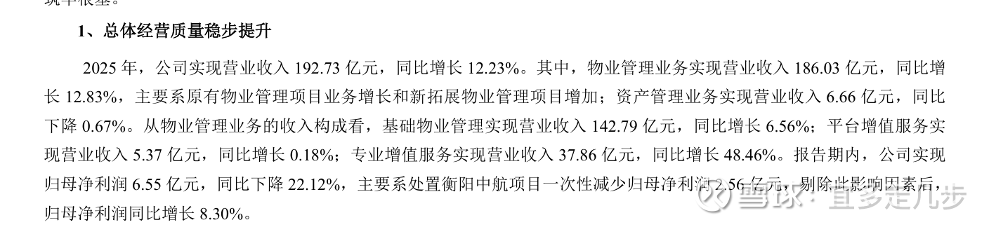招商积余是招商局集团旗下的物业资产管理平台,2019 年,招商局把中航善达和招商物业重组,才有了现在的这家公司。这几年公司一直在做减法,直到 2025 年底,彻底把遗留的衡阳地产项目给处置了。虽然这事儿导致去年报表净利润短期下滑了 22%,但这是一次性的阵痛 —— 剔除这个影响,公司核心净利润其实还涨了 8.3%,营收更是保持了 12.23% 的双位数增长。