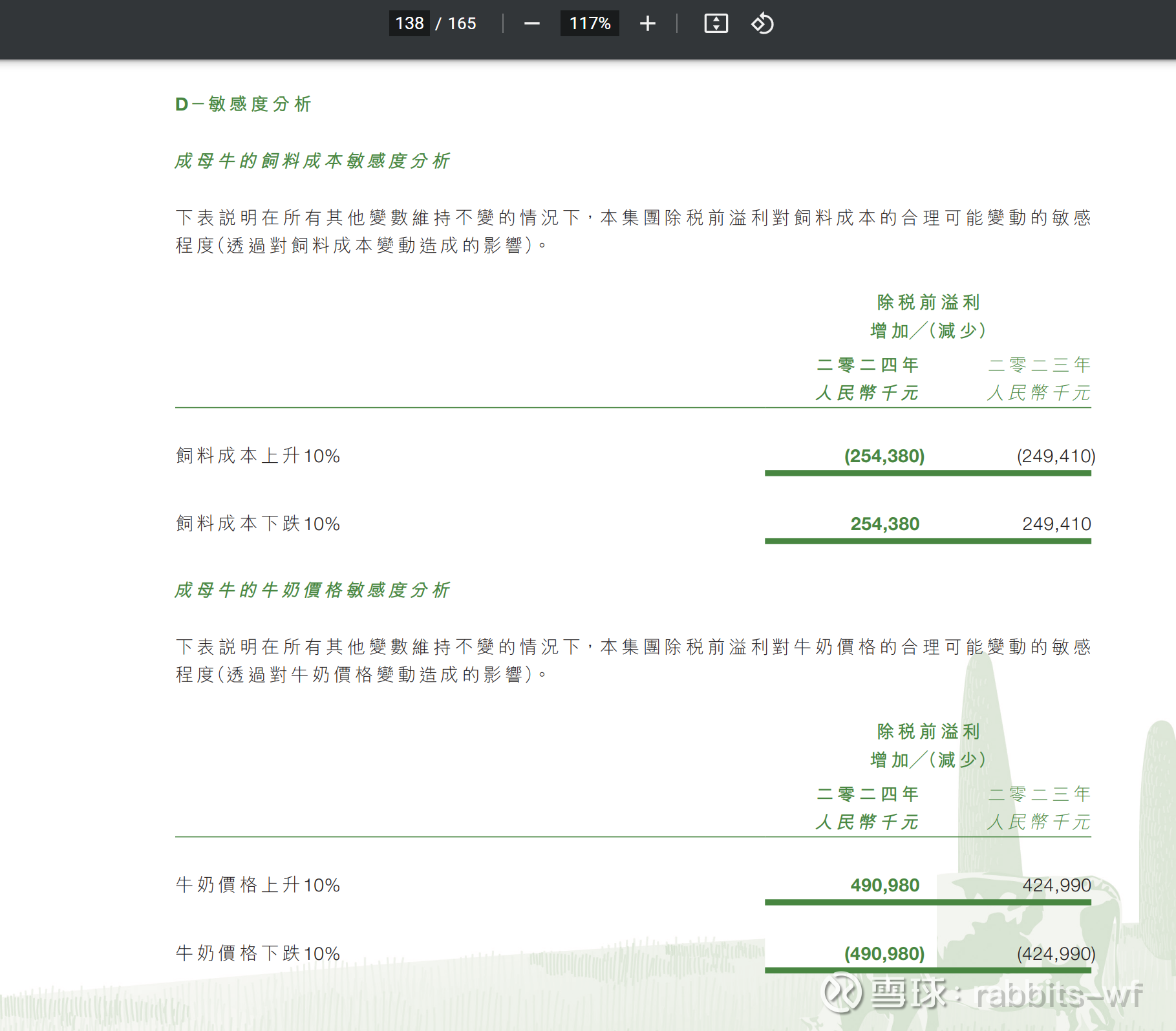 回复@南海钓叟: 可以翻$原生态牧业(01431)$ 2024年年报p138页,公司有自己列示敏感性分析,奶价上涨10%对应5亿的利润弹性。