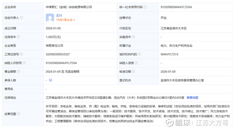 今日,企查查一则工商信息更新,在盐城新能源产业圈内激起不小波澜:一家注册资本达1000万元的 “中煤君汇(盐城)综合能源有限公司” 悄然成立。