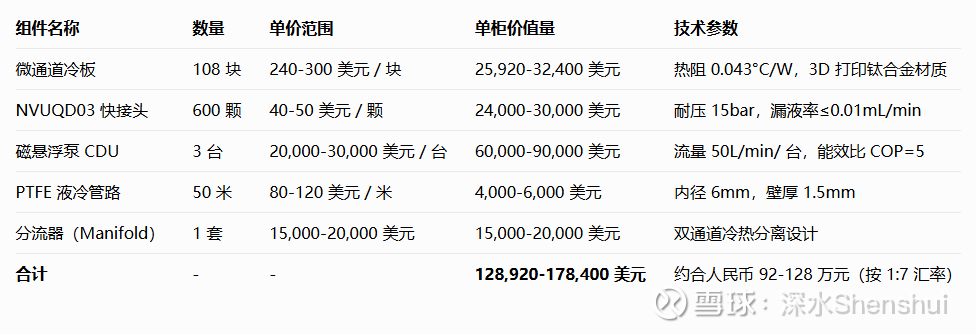 根据2025年08月27日投资者关系活动记录表显示,以GB300 为例,一个大的机柜会用100多块液冷板,液冷板的市面价值预估300 美元一块,一个机柜液冷板的总价值量是3W美元左右,机柜钣金件包 括内部的一些支撑件都算上是8K-1.2W美元,$祥鑫科技(SZ002965)$ 预计可供货价值在4W 美元左右。