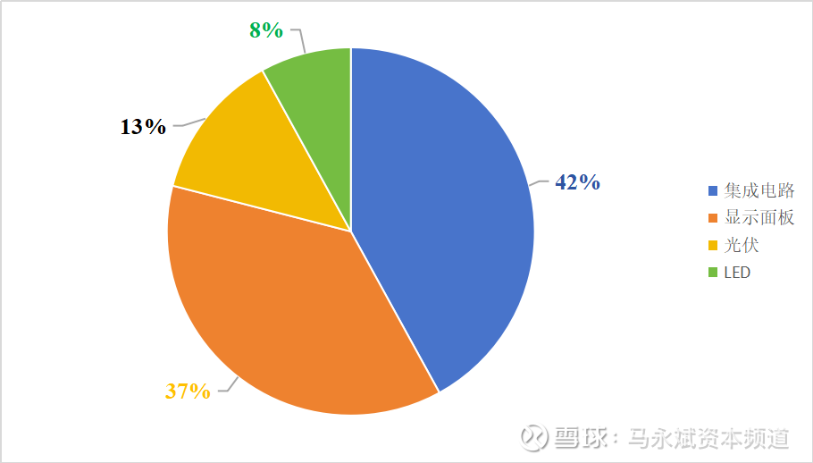 需要说明的是,电子特气并不限于集成电路制造。在显示面板、LED、光伏电池等电子工业中也有广泛应用,所需气体与半导体有相通之处。总体来看,根据观研天下的数据,2024年集成电路行业消耗了约七成的电子特气,其余三成由面板、光伏、LED等共享。但在我国,由于面板产业规模巨大,本土电子特气下游需求中显示面板占比高达37%,而集成电路占比约42%,其余光伏为13%,LED为8%。
