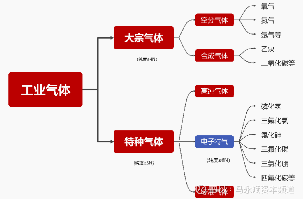 在工业气体分类中,按纯度和用途可以分为大宗气体和特种气体两大类。大宗气体包括氧、氮、氩等空分气体以及乙炔、二氧化碳等合成气体,纯度一般在4N (99.99%)以下,主要应用于钢铁、化工等传统行业。而特种气体则用于特定领域,纯度要求在5N以上,进一步细分为标准气体、高纯气体和电子特种气体等,其中电子特气对纯度要求最高,一般需达到6N(99.9999%)以上。