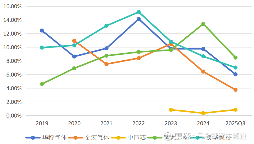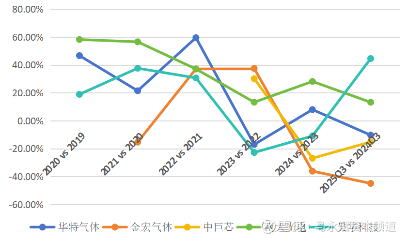 资料来源:华特气体2019-2024年报,2025年年中报,2025Q3季度报,Wind金融终端,各公司相关定期报告