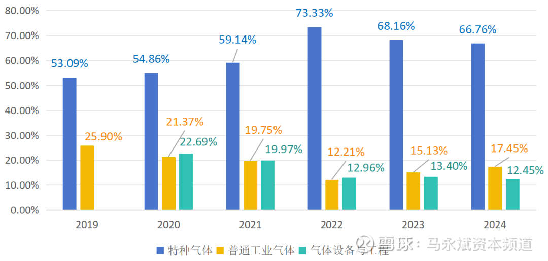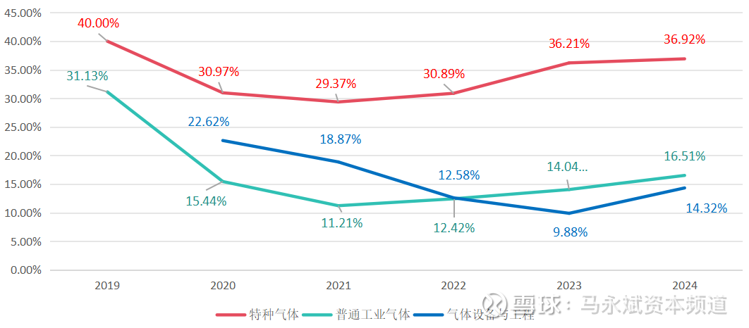 增长失速主要反映出下游需求的周期波动,2024年行业仍处筑底阶段,公司营收继续小幅下降7.0%,但通过提质增效实现了净利润逆势同比增长8.0%,发展质量有所改善。公司增长主要源于内生业务扩张,特种气体这一核心板块贡献了大部分增量,成长的可持续性和战略聚焦度较高。