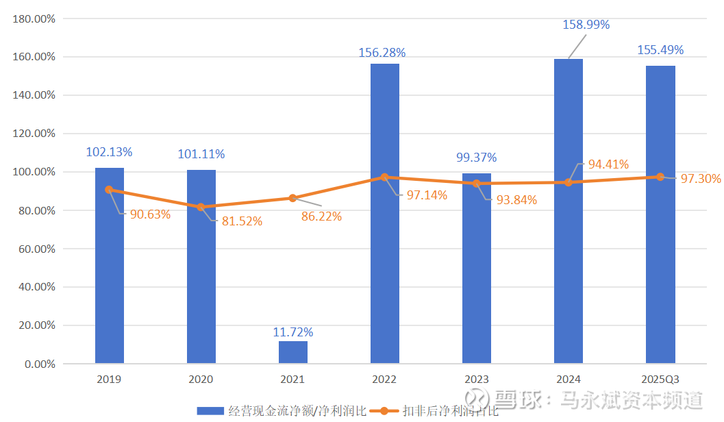 随着主营业务贡献增强,这一比例在2021年升至86.2%,2022年大幅提高至97.1%,2023-2024年也保持在94%以上。可见近年来公司利润几乎全部来自主业经营,非经常性收益依赖度很低,利润质量日趋扎实。