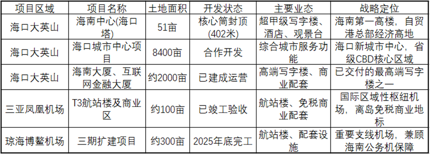 海南机场在海南地区的房地产项目主要集中在海口大英山CBD和三亚凤凰机场周边两大区域,形成了多层次、多业态的开发格局。