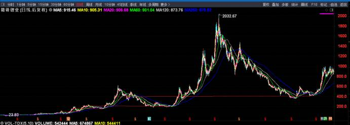 赣锋股价,上一轮周期高峰期股价等于下一轮周期低谷期股价。