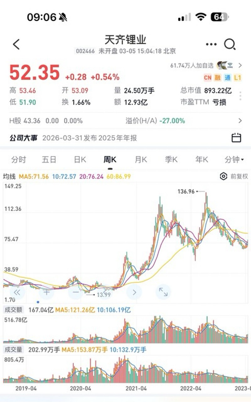 2025年初到2026年第一季度,钨矿的价格涨了4倍多了,预计25年全年23亿多利润,股价已经涨了六七倍,不知道能不能复制天齐锂业次年利润翻十倍的奇迹?我们假设能翻十倍,26年利润达到200亿,那对比天齐锂业22年240亿利润,厦门钨业的股价顶部在哪里?又什么时候见顶呢?