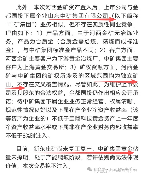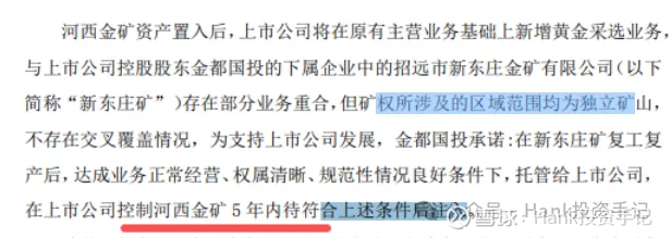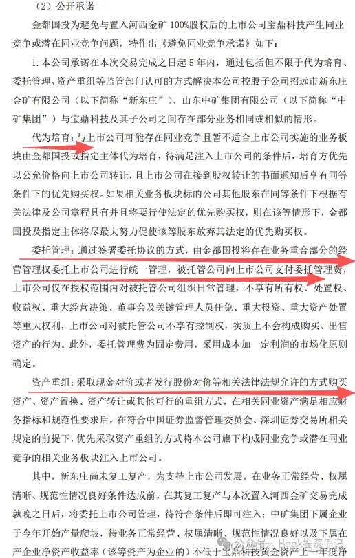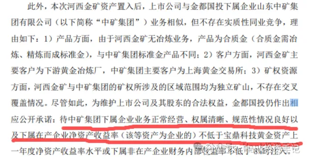 所以从资产注入角度来说,虽然宝鼎科技现在和招金矿业、招金黄金都在招金集团旗下,但从关系上来说和中矿集团更近,接受资产注入来解决同业竞争也更顺理成章。而且金都国投此前也有过承诺在上市公司控制河西金矿5年内待符合上述条件后注入,注入前,中矿集团代为培育: