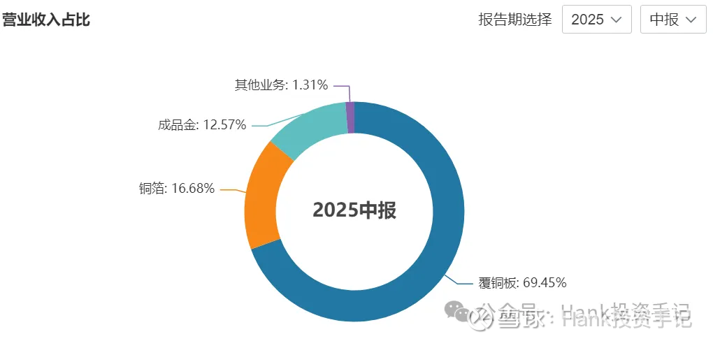 公司目前69.45%的营收来自覆铜板,16.68%营收来自铜箔,这两块对应名字中科技的部分。还有12.57%收入来自黄金。